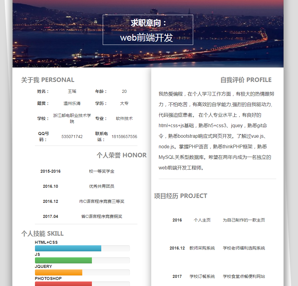 我热爱编程,在个人学习工作方面,有极大的热情跟努力,不怕吃苦,有高效的自学能力,强烈的自我驱动力,代码强迫症患者。 在个人专业水平上,有良好的html+css+js基础,掌握h5+css3、jquey,熟悉bootstrap响应式网页开发。了解vue.js跟node.js。掌握PHP语言,熟悉thinkPHP框架,熟悉MySQL关系型数据库。希望在两年内成为一名独立的web前端开发工程师。